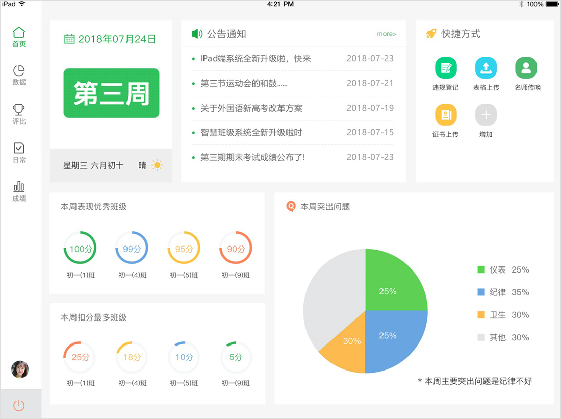 3、Pad查問班級活動相關往常網上辦理數據報告。表示歉意教員暗示暗示布告和召喚新信息。
